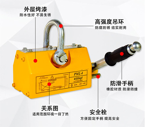 安全系數(shù)高,最大拉脫力是額定起重力的 2.8-4 倍。手動(dòng)型永磁起重器手柄開關(guān)附有安全鈕,可單手操作,方便安全。起重底面“ V ”型槽設(shè)計(jì)。全自動(dòng)永磁起重器無(wú)需人力扳動(dòng)手柄,靠電動(dòng)吊車下鉤的升降控制吸附,可起吊相對(duì)應(yīng)的圓鋼、鋼板,不用電,使用安全,廣泛用于鋼材的起重搬運(yùn),平整的機(jī)械零部件及各種模具的安裝和搬運(yùn)。